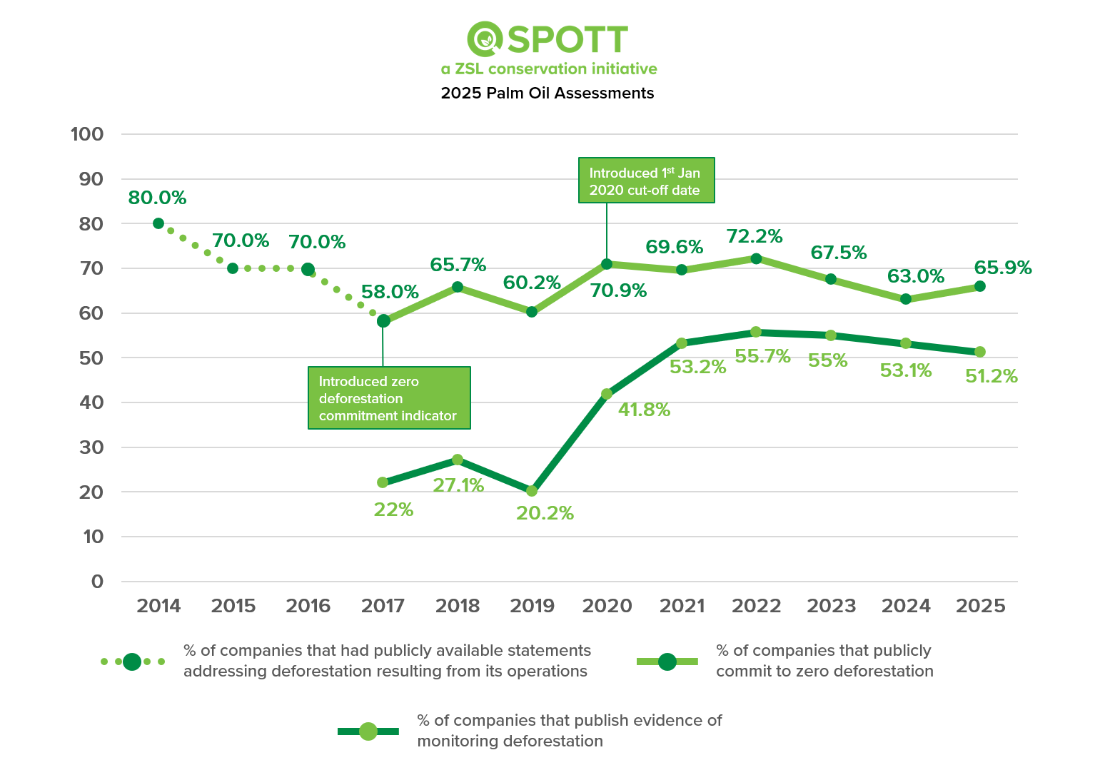 SPOTT palm oil assessments over the last eleven years have revealed continued progress in the number of companies making zero-deforestation commitments. In 2017, 29 out of 50 assessed companies reported commitments to ending deforestation. Today’s assessment reveals that 54 out of 82 companies have now made these commitments.